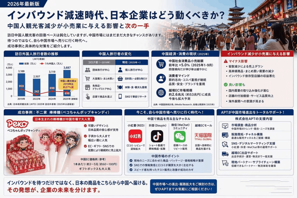 そこで今、日本企業が考えるべきなのは、来店を待つだけでなく、自ら中国市場へ売りに行くことです。日本国内で中国人観光客を待つ時代から、中国国内で売上を作る時代へ発想を変える必要があります。これは大企業だけの話ではなく、中小企業でも十分可能です。